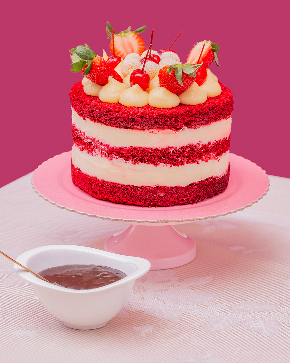Pão de ló vermelho, com toque de cacau, recheio de cream cheese com baunilha e limão, coberta com branquinho mole e frutas vermelhas.) *Acompanha calda de chocolate.